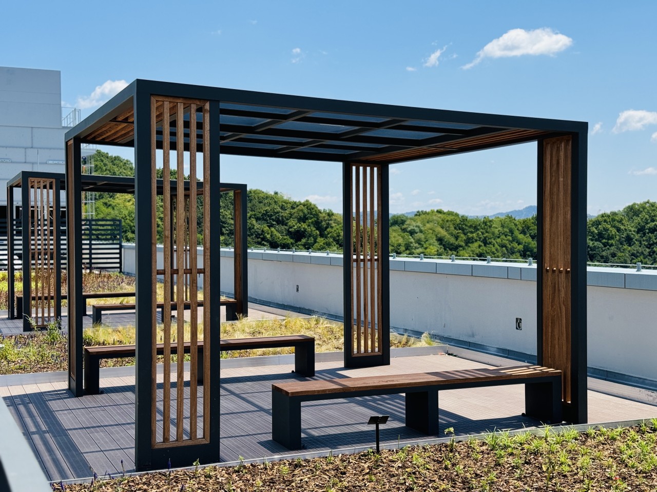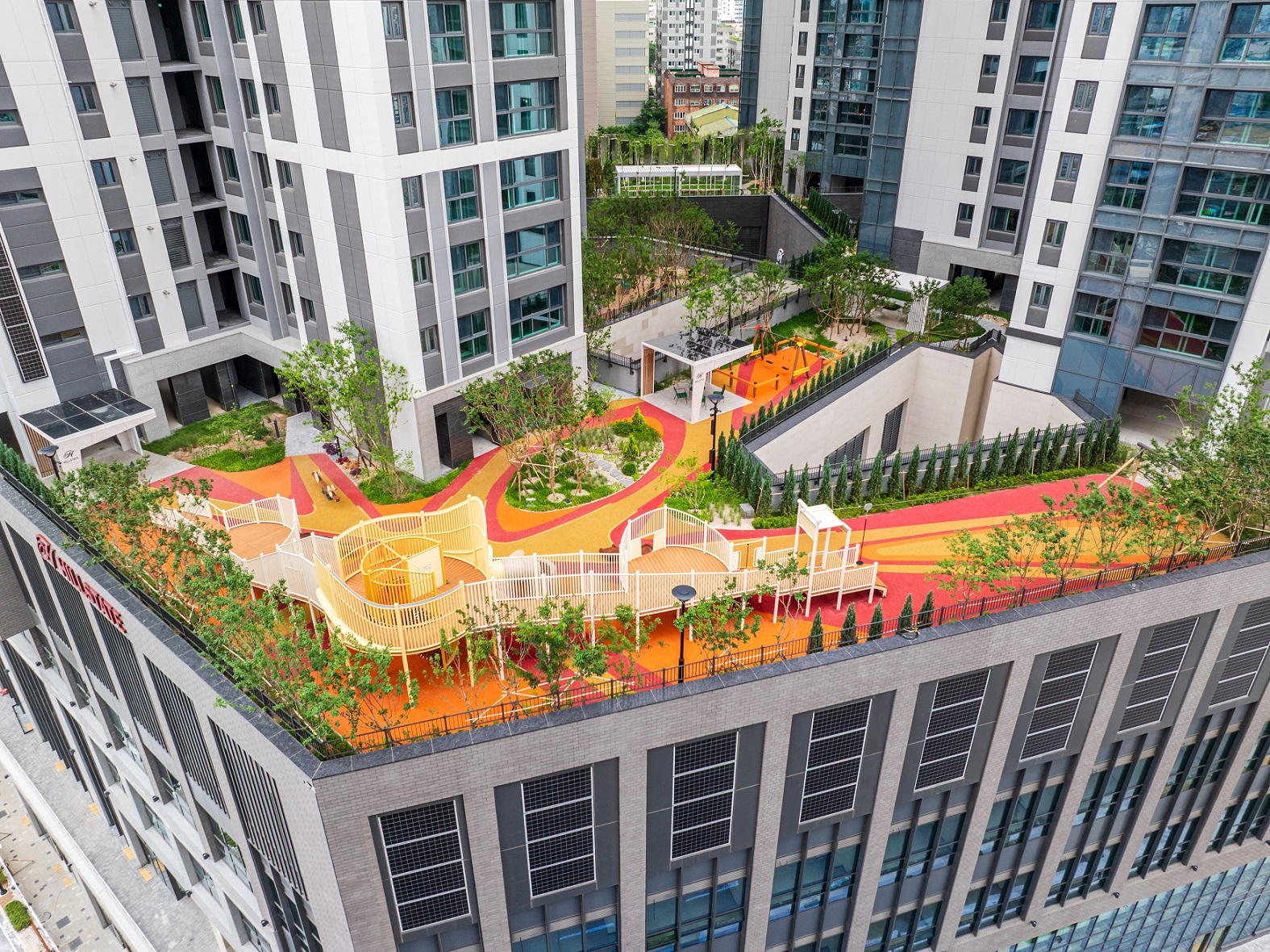 <힐스테이트 향동>의 옥상과 지상에 마련된 정원은 부족한 토심, 구조물의 하중, 강한 바람 등 인공지반의 물리적 한계를 극복하는 데에 집중했다. 식물의 뿌리가 구조물의 내구성을 저하시키지 않도록 방근층을 설치하고, 경량토양을 통해 하중 부담을 최소화하며 통기성 및 수분유지 능력을 높였다. 특히, 계절 초화를 식재한 하늘정원, 봉산을 배경으로 조성한 암석원 등 다양한 공간 연출을 통해 자연과 어우러지는 예술적 공간으로 구성했다.