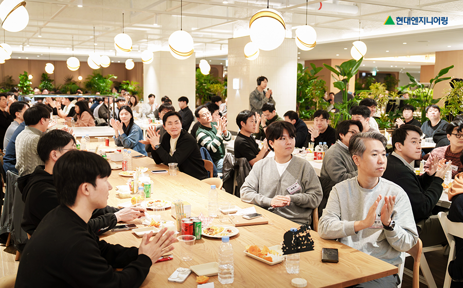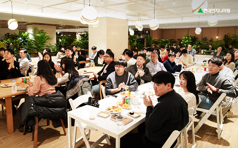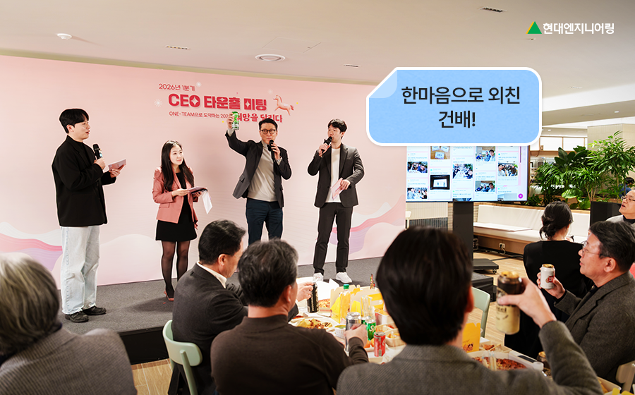 👩🏻김민주 책임: 맞아요! 사실 건배사라는 게 자칫 지루해질 수 있어서 걱정했잖아요? 그런데 웬 걸요! ‘기술로, 세계를!’, ‘우리가, 미래다’, ‘기필코, 달성!’ 같은 패기 넘치는 구호들이 터져 나올 때 행사장의 열기가 점점 더 뜨거워지는 게 느껴졌어요.