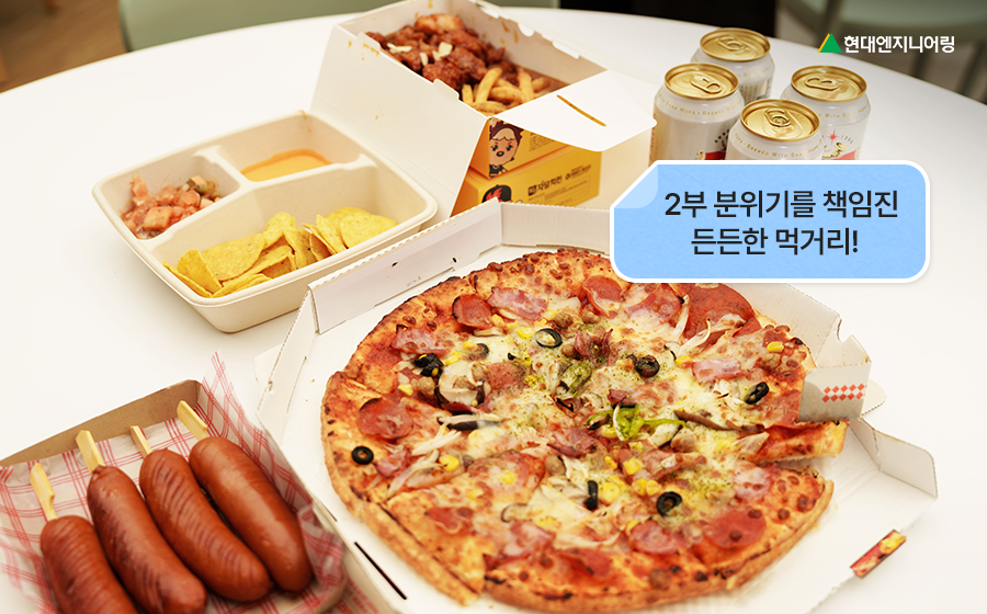 👩🏻김민주 책임: 와, 진짜 치킨에 피자, 소시지, 나초까지 끊임없이 나오는데 임직원분들 반응이 정말 폭발적이었어요. 솔직히 그냥 가벼운 피맥 정도일 줄 알았는데, 시원한 맥주와 탄산음료까지 넉넉하게 제공되니 완전 축제 그 자체였죠. 행사를 준비했던 입장으로써, 저도 모르게 어깨가 으쓱했습니다.