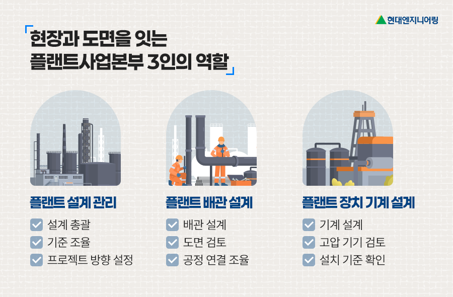 세 분의 이야기를 통해 플랜트 설계/엔지니어링이 단순히 도면을 그리는 업무를 넘어, 수많은 변수를 계산하고 다양한 분야와 협업하며 하나의 프로젝트를 완성해가는 과정임을 확인할 수 있었습니다. 각자의 자리에서 기준을 세우고 조율해온 임직원 분들이 있기에, 오늘도 현대엔지니어링의 플랜트는 안정적으로 완공을 향해 나아갑니다.