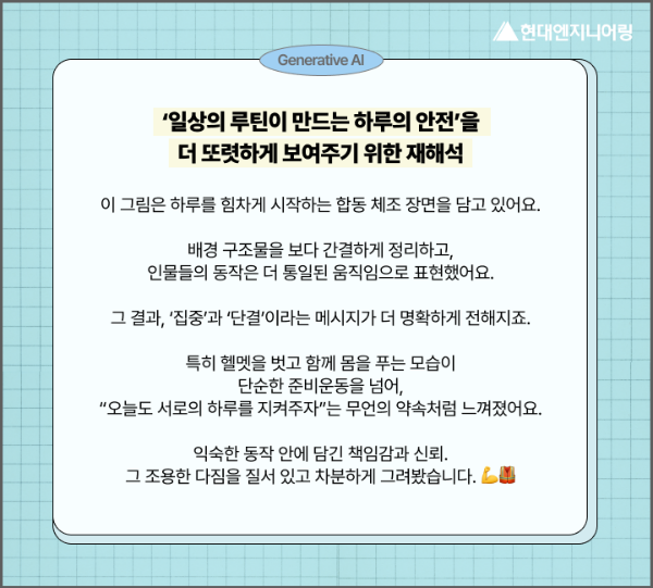 AI는 이 장면을 매일 같은 시간, 같은 장소에서 같은 동작을 함께 반복하는 이 일상의 루틴이 각자의 안전뿐 아니라 현장을 지키는 책임감과 근면함, 조직성 등의 집합이라고 봤어요. 🤝