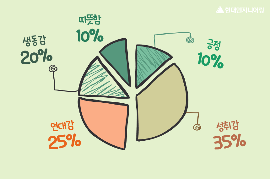 조금은 예상했던대로, 성취감(35%)이 가장 크게 나타났어요. 팀원 모두가 메달을 들고, 활짝 웃는 얼굴로 정면을 바라보고 있는 구도가 강한 에너지를 전달했대요.