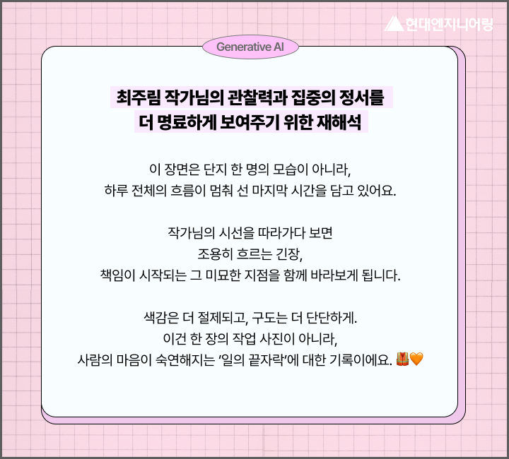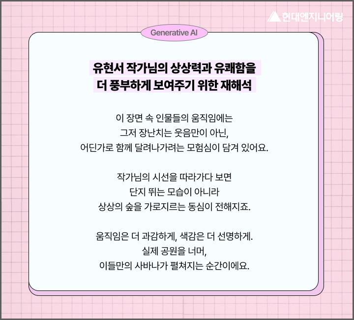 유현서, 김태완, 이청규, 최주림 4명의 현대엔지니어링 소속 미술 작가님의 손끝에서 시작된 따뜻한 장면들 위에, AI의 시선을 입혀봤어요. 😊✨