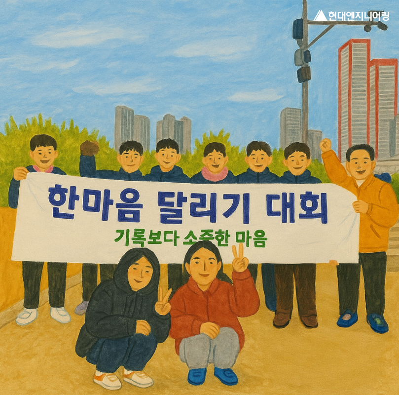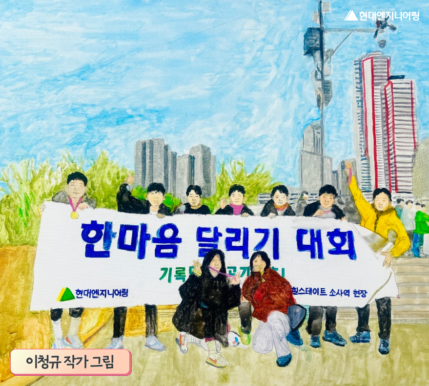 이번 그림은 이청규 작가의 ‘소소모임 소사현장 Refresh로 소소한 행복 찾기 프로젝트(2024년 작)’입니다. 현장의 팀원들이 참여한 ‘한마음 달리기 대회’의 사진을 바탕으로, 작가님 만의 따뜻한 시선을 더한 작품이에요.
