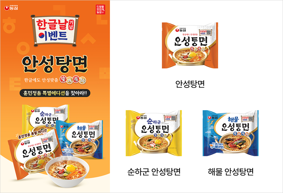 라면 안성탕면도, 옛 모음 ’아래 아(、)’를 살린 훈민정음 특별 에디션을 출시했는데요. 한글날 특별 패키징을 찾아 인스타그램에 해시태그로 인증샷을 올리면 아이폰 등 선물을 주는 한글날 이벤트도 올해 10월까지 진행 중입니다. 해외 여행에서 이 에디션을 만나면 애국심이 올라올 것 같은 느낌! 🤩🍜