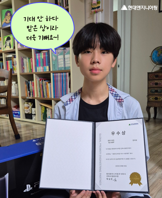 이번 대회를 준비하면서 아빠가 일하는 곳을 유튜브로 보게 되었는데, 현장이 엄청 넓고 건물도 높아서 조금 무서워 보였어요. 그런데도 아빠가 씩씩하게 일하시는 걸 보고 “와, 아빠 진짜 멋지다!”라고 생각했답니다. ㅎㅎ