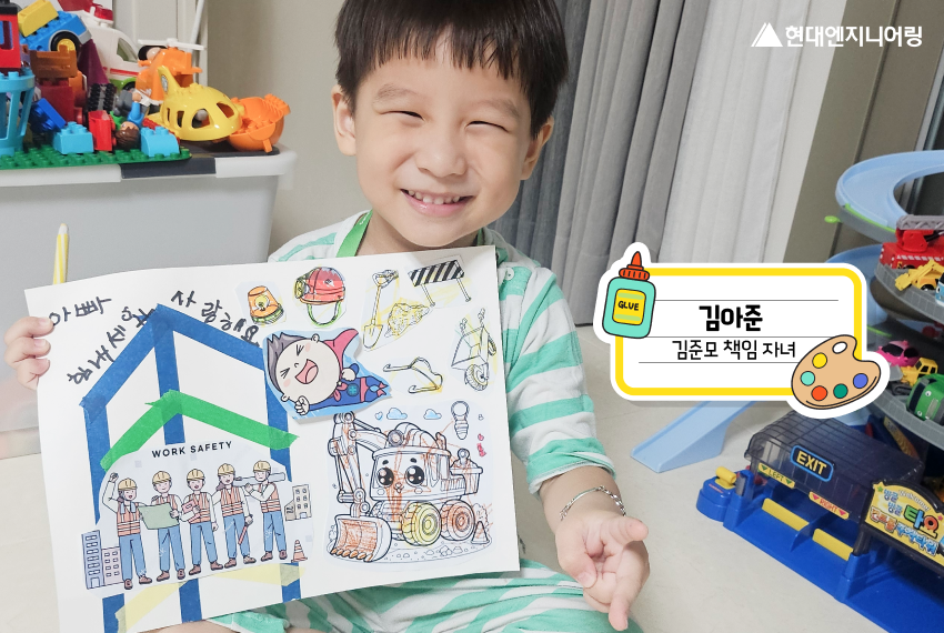 제 그림 제목은 “안전한 현장! 안전한 가족!”이에요. 저는 아빠를 세상에서 제~일 좋아하거든요! 그래서 아빠가 다치지 않고, 즐겁게 일하셨으면 하는 마음으로 아빠랑 함께 있는 우리 가족의 모습을 그렸보았어요. 💕