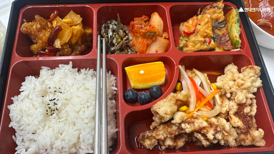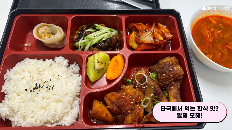 매일의 소소하게 즐거운 순간은 아무래도 점심시간?! 이라고 할 수 있는데요. 저희가 오전 7시부터 오후 6시까지 근무하고, 점심시간은 11시 30분부터 1시까지거든요. 그때 현장 근처에 있는 한식당 분점에서 도시락을 주문해 먹는데, 해외에서 한식을 먹을 수 있다는 게 생각보다! 훨씬 더! 큰 힘이 됩니다. 🍱 슬로박에서 먹는 한식 도시락? 완전 꿀맛 이랍니다~!?(궁금하면, 해외 근무 고고~? ㅎㅎ)