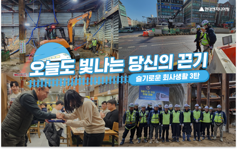 저의 하루는 아침 공기를 마시며 TBM(Tool Box Meeting, 작업 전 안전점검회의) 점검으로 시작돼요! 오전엔 터널 구조물 시공 현황 확인 및 검측을 진행하고, 오후에는 사무실로 복귀해 서류 정리와 발주청 제출용 영상 편집으로 하루를 마무리하죠. 안타깝게도, 집이 먼지라 퇴근 후에는 빠르게 귀가하는 편인데요.😆 매일 반복되는 일상 같지만, 그 안에서 현장이 조금씩 완성되어 가고 저도 조금씩 성장하고 있다는 걸 생각하면 뿌듯합니다.