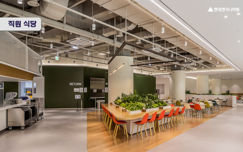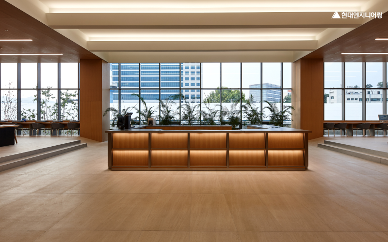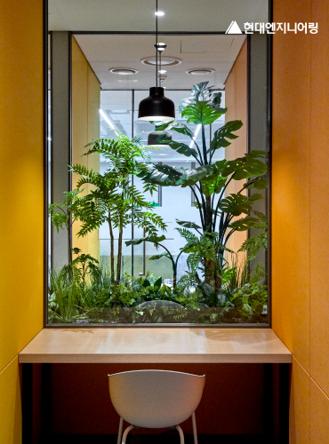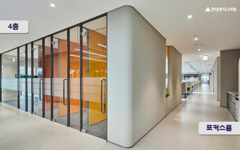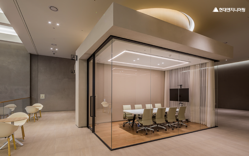 이 오피스는 집중력과 창의력을 높이는 색상과 마감재가 조화를 이루며, 현대엔지니어링이 지향하는 미래형 오피스 디자인의 방향을 보여주고 있습니다.