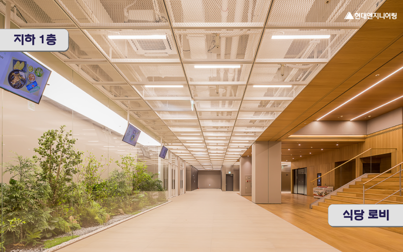 높은 천장고를 적용한 로비와 중앙계단, 연구사무공간은 개방감을 주며, 집중력과 창의성을 높이는 색상과 마감재, 용도별 회의실 인테리어로 기능성을 더했습니다. 또한 1층 실내정원과 엘리베이터 홀에는 광덕트(자연광을 건물 내부 깊숙한 곳까지 끌어들이는 시스템)를 활용한 실내조경을 통해 자연과 빛이 어우러진 친환경 재충전 공간을 구현했습니다.