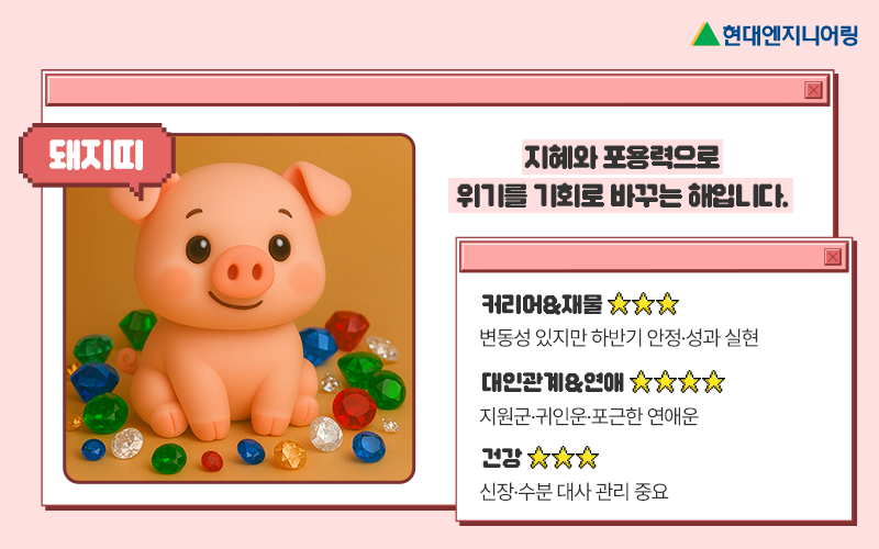 커리어&재물: 변동성이 큰 한 해이지만, 돼지띠의 낙천성과 유연함이 위기를 기회로 바꿔줍니다. 상반기에는 예상치 못한 변화가 생길 수 있지만, 직관·경험을 함께 활용하면 좋은 방향으로 흐름을 바꿀 수 있습니다. 하반기에는 분위기가 안정되기 시작하며 재물·커리어운이 실제 성과로 이어지기 좋은 시기입니다.💎