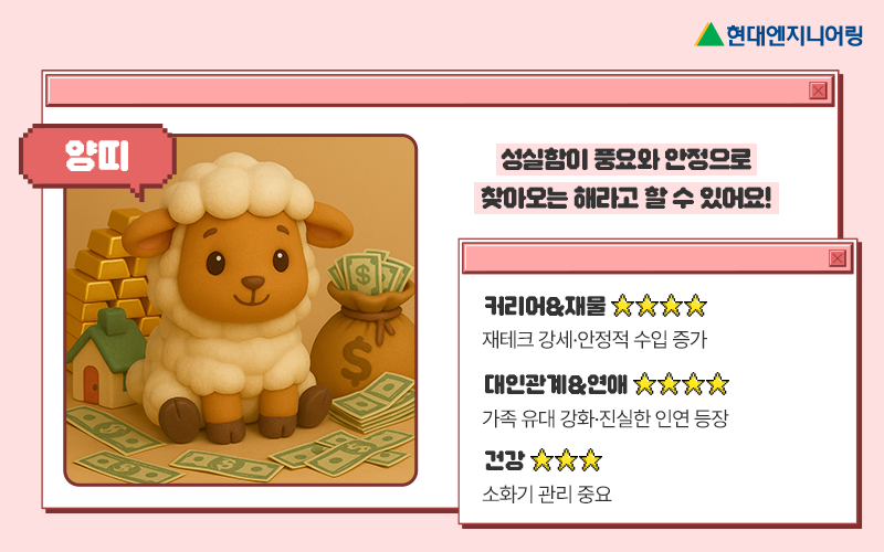 커리어&재물: 재물운과 안정운이 동시에 상승합니다. 상반기에는 재테크·부동산·장기 투자에서 좋은 기회가 들어옵니다. 안정적인 수입원이 늘어나 재정 기반이 더욱 탄탄해지며, 눈에 띄는 재테크 성과를 맞이할 수 있는데요. 양띠 특유의 신중함과 실용적인 선택으로 더 큰 이익을 맞이할 수 있어요. 💸