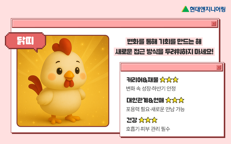 커리어&재물: 변화와 적응이 필요한 해지만, 이 과정은 닭띠를 더욱 정교하고 단단한 사람으로 성장시킵니다. 재물운은 상반기에는 다소 지출이 많지만, 하반기에는 투자·재테크 기회가 들어오며 점차 안정되는 흐름입니다. 🪙