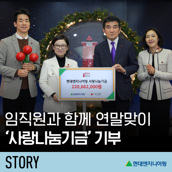 이번 사랑나눔기금에 참여한 현대엔지니어링 임직원은 “임직원들의 따뜻한 마음이 모여 사회에 온기를 더할 수 있어서 큰 보람을 느낀다”며, “회사와 함께 나눔에 참여할 수 있어 더욱 뜻깊다”고 말했다.